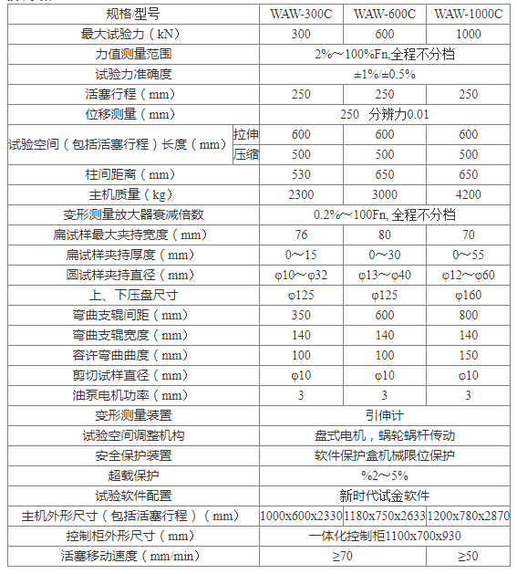 1.WAW-300C/600C/1000C型微機控制電液伺服萬能試驗機,采用油缸下置式主機,拉伸空間位于主機的上方,壓縮彎曲試驗空間位于主機下橫梁和工作臺之間油缸活塞采用間隙密封經久耐用