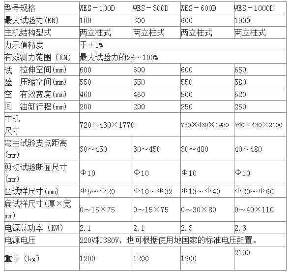 WES系列數顯式液壓萬能試驗機采用引進日本島津技術生產的油缸下置式主機,主機由機座、油缸、活塞、壓力傳感器、升降電機、減速器、鏈輪、絲杠、試臺、立柱、上、下橫梁、液壓自動夾具或手動夾緊夾具等組成。在上橫梁和試臺間由兩根立杠聯接,用下橫梁升降調整試驗空間。液壓控制系統有油箱、高壓油泵、油路板組、工作油缸、工作活塞等組成。