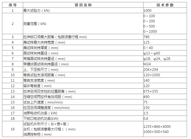 ●WE-1000A型液壓式萬能試驗機主要技術規(guī)格及參數(shù):