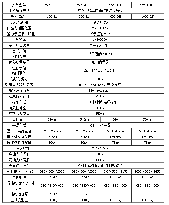 WAW-B系列微機控制電液伺服萬能試驗機由雙立柱雙絲杠油缸下置式主機及琴式油源控制柜組成,油泵采用意大利馬祖奇進口低噪音高性能齒輪泵。拉伸空間位于主機上方,壓縮、彎曲試驗位于主機下方即中橫梁和工作臺之間。試驗空間的調整通過移動中橫梁來實現,中橫梁升降采用鏈條傳動。計算機全自動閉環控制高性能電液比例伺服閥來完成對各種材料的拉伸、壓縮、彎曲等試驗。試驗完成以后自動采取材料的FM、REH、REL、RPO.2、RP1、RM和彈性模量E等實驗結果。