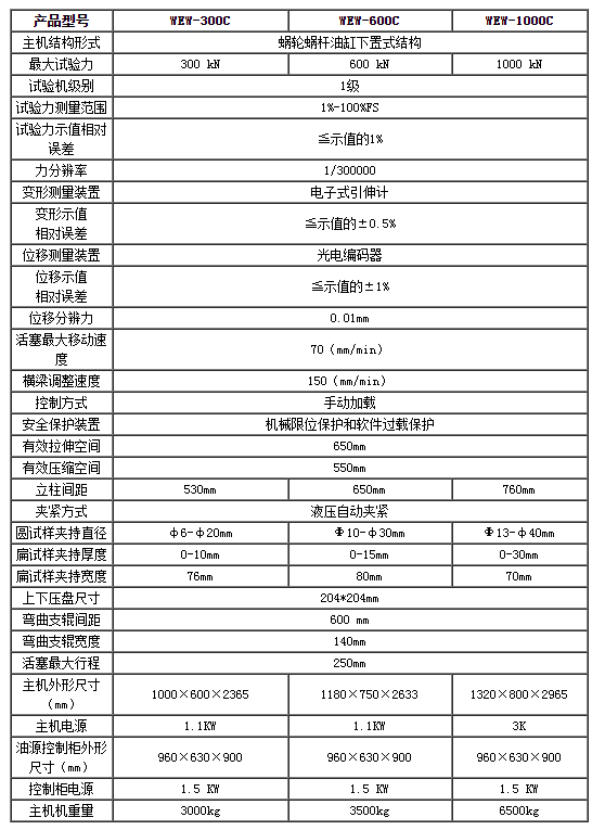 濟南試金WEW-C系列微機屏顯式液壓萬能試驗機主要用于金屬材料的拉伸、壓縮、彎曲等力學性能試驗,增加簡單的附件后可對水泥、混凝土、磚、瓦、橡膠及其制品進行檢測。
