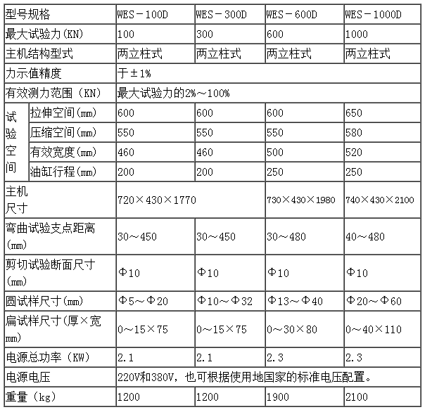 WES系列數顯式液壓萬能試驗機采用引進日本島津技術生產的油缸下置式主機,主機由機座、油缸、活塞、壓力傳感器、升降電機、減速器、鏈輪、絲杠、試臺、立柱、上、下橫梁、液壓自動夾具或手動夾緊夾具等組成。在上橫梁和試臺間由兩根立杠聯接,用下橫梁升降調整試驗空間。液壓控制系統有油箱、高壓油泵、油路板組、工作油缸、工作活塞等組成。